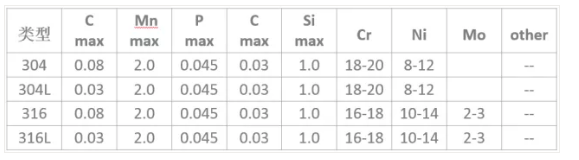 不銹鋼:耐空氣、蒸汽、水等弱腐蝕介質(zhì)或具有不銹性的鋼種。通常使用的鋼種為304、304L、316、 316L,是奧氏體不銹鋼的300系列鋼。
