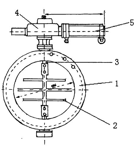 針對上述提到的塵氣碟閥的缺點,本文提供一種新型的塵氣蝶閥。為了實現(xiàn)上述目的,本實用新型所采取的措施氣動式斜板塵氣蝶閥,包括閥體和閥桿,所述的閥體內(nèi)設(shè)有采用傾斜方式關(guān)閉的碟板,碟板與閥桿相連。所述的閥體上設(shè)有機(jī)械裝置和通過機(jī)械裝置對碟板執(zhí)行啟閉的氣動裝置。本實用新型的有益效果閥門啟閉阻力減小,自動化程度大大提高,利于推廣應(yīng)用。